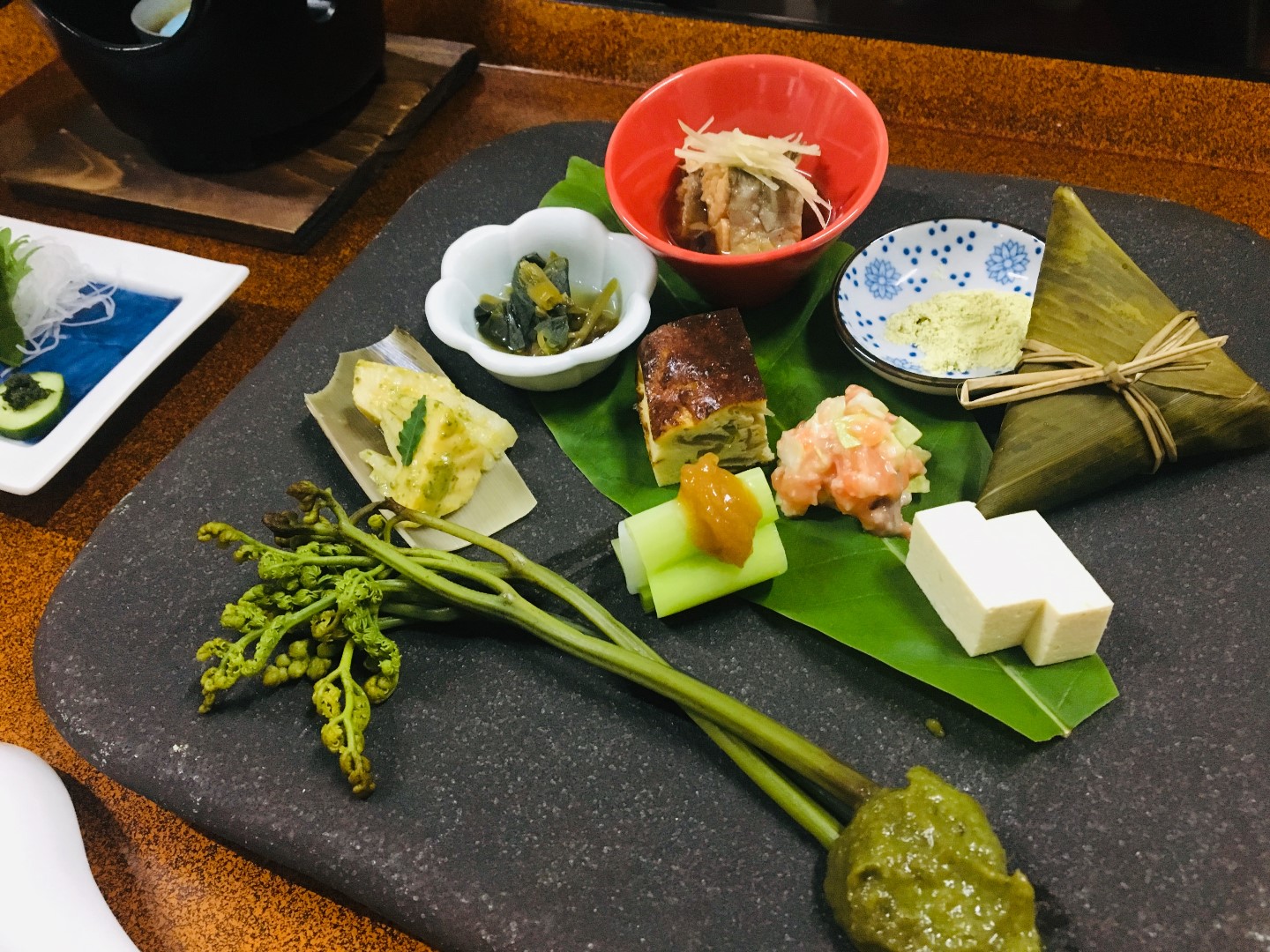 こんにちは!6月になり、衣替えの時期になりましたね!学校では、そろそろプールの授業が始まった頃でしょうか?体育の授業が待ち遠しく感じていた頃を懐かしく思います。最近の当館の夕食の前菜に古代米入りちまきが出ています。(写真の右上)昨年の福島産こがねもちを使用しております、福島県の郷土料理でございます。一つ一つ丁寧に手作りしております。当館の愛情たっぷりのちまき、ぜひご賞味くださいませ。きな粉をたっぷり付けて食べるのが、私のおすすめです!(甘いもの大好きなんです)こちらのちまきは数に限りがございます。ご了承くださいませ。