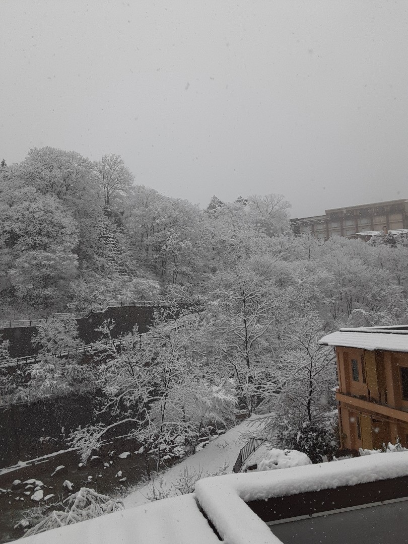 今日は全国的に気温が低く寒い一日ですね。土湯温泉は夜から雪になり今朝一面銀世界(*´▽`*)例年で比べると驚くことではないのですが今年雪がほぼ降らなかった事と3月末にこの量というのが正直驚いています。お越しのお客様は必ずスタットレスタイヤ着用もしくは交通機関でのお越しをお願い致します。ほんとに暖かい日が続いていて市内で桜が開花したりと春をとても感じていたのでまさかまた雪見できると思っていなかったので朝からテンションが上がってしまって…(*^^)v童心に戻ってお外ではしゃいでしまいました(笑)今年最後と思われるので雪を見に土湯温泉いらしてみてはいかがでしょうか。雪合戦もぜひ♪