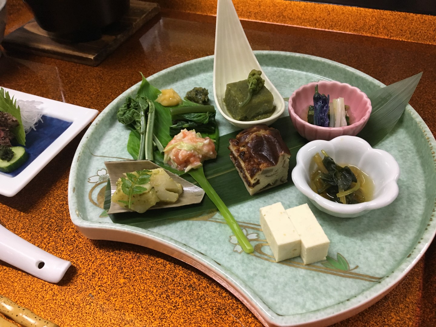 こんにちは。 今回は、とある日の夕食の前菜を紹介させて頂きます。 こごみや筍、ピンク色の器のカタクリ… 前菜に使用しております山菜はすべて当館のスタッフが土湯で採ったものでございます。 他に料理長ひと手間加えて作っているものも多数! 写真の奥の方に写っている緑色のお豆腐は、蕨のお豆腐でございます。 実は下に、蕨をすりつぶして作ったソースも隠れているんですよ 一つ一つご紹介したい所ですが、ぜひ皆様の五感で感じていただきたいと思います! 山菜の採取出来る季節も残り少なくなっておりますが、採取出来る期間は、ほぼ毎日前菜に使用しております。 料理長が毎日、素材一つ一つ美味しさを生かしながら丹精込めて調理しております。 土湯の味覚を味わいにぜひ当館へお越しくださいませ