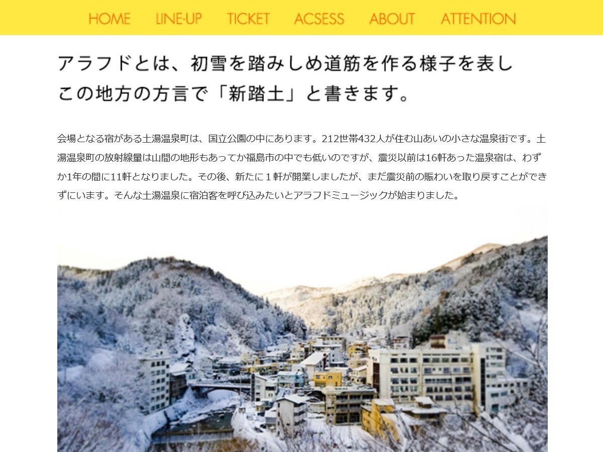 こんにちは。本日の最高気温は5℃ さっと外に出るだけでも冷えが纏わりつきますね。そんな日は、温泉に浸かってのんびり過ごしたいものです。さて、明日はいよいよ待ちに待った【アラフドミュージック】!!温泉旅館の大宴会場にて行われる「最も小さな音楽フェス」です。以下HPより抜粋温泉旅館の大宴会場でLIVEを楽しめたら良いじゃない!アラフドミュージックはそんな思い付きからはじまったイベントです。実際にやってみたら…、思った通り最高でした!のんびり座って歌声に耳を傾けられる。ミュージシャンとの距離が近い。お酒を飲みすぎて酔っ払っても布団が敷かれた部屋が待っている。おいしい夕食と朝食が食べられる。そして、温泉が最高に気持ちいい。それだけでも極上のイベントなんですが、さらに楽しんでもらうべく、福島県内の料理人や農家に声をかけ、この日のために腕を振るってもらった特別な料理を用意しました。お酒も福島の酒蔵が無農薬米だけで仕込んだ日本酒を味わえます。 120畳の宴会場でゆったりと贅沢な時間を過ごしてもらうために、イベントの定員はわずか200人。 小さなライブハウス並みの客数で、おそらく日本で一番小さなフェスです。 素晴らしい音楽とともに福島の今を感じられる「大人の修学旅行」 ARAFUDO MUSICに、ぜひ遊びに来てください。温泉場での楽しい一日をどうぞお楽しみください。