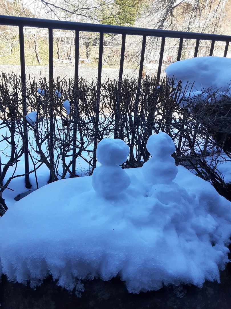 こんにちは、今日は暖かい日差しが届いて路面凍結も少し融けた土湯温泉です。 お掃除の時間にお客様からのサプライズに気が付き、思わず立ち止まって和ませていただきました♪一階貸切露天風呂の岩の上にとても可愛らしい雪だるまさんがペアで☆ 今年は積雪が多く寒さが厳しかったりコロナがまた猛威を振るっていたりとなんだか個人的に気持ちに余裕がなかったのですが最高に嬉しいサプライズでした! ほっこりした一日でした…