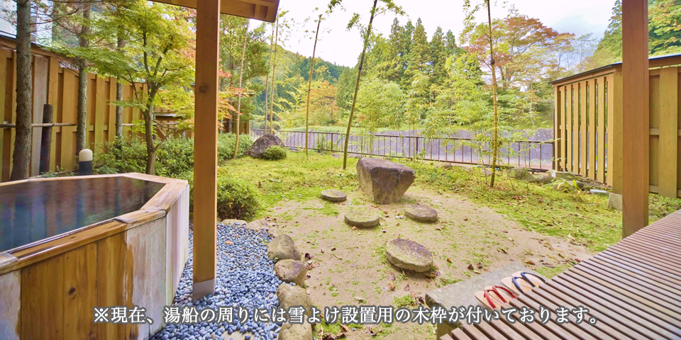 源泉掛け流しのひのき造りの露天風呂と、専用のお庭のついたお部屋です。露天風呂は大人が3人一緒に入る事が出来る大きさです。