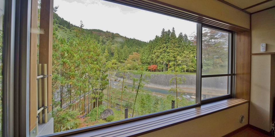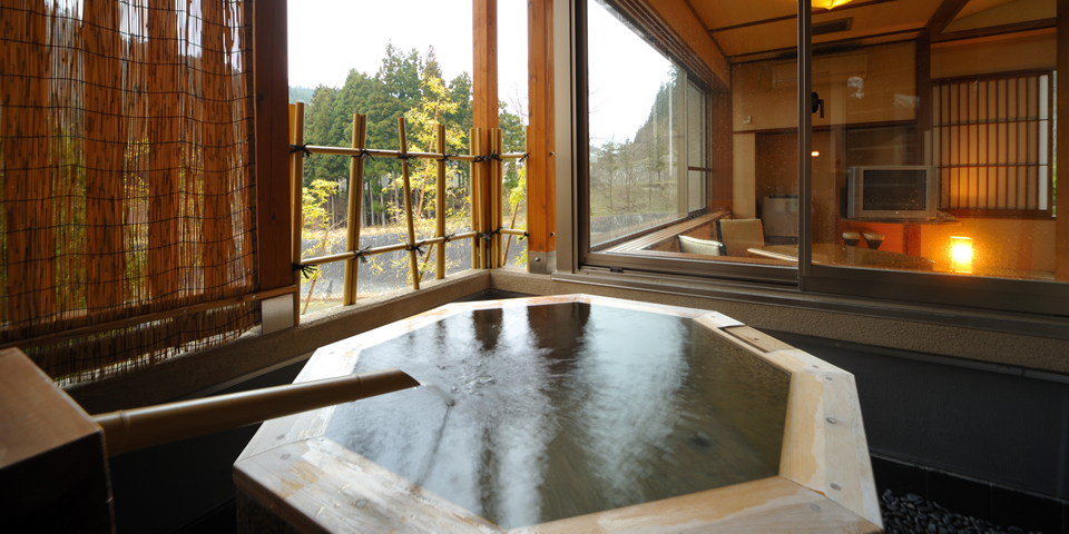 源泉掛け流しの、みかげ石造りの露天風呂の着いたお部屋です。お風呂は大人2名一緒に入る事が出来ます。窓から見える緑と清流に時間を忘れ、のんびりお過ごし頂ければ幸いです。